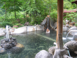 大町市街の西・龍神湖の先にある宿で、立ち寄り湯が可能。高瀬の湯と炭酸の湯の2つの泉源から引いた弱アルカリ性低張性高温泉。源泉かけ流しで、直に触るとカナリ熱い。内湯の他に森林に囲まれた開放的な露天(画像右)もある。効能は筋肉痛や疲労回復で登山やスキー帰りに好適である。石鹸類は完備されておりタオルだけで入浴可能。なお、午前中の早い時間は清掃のため入浴できない。10時以降に行くことをオイラは薦める。 |