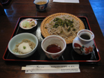穂高駅すぐ近くの日本蕎麦屋。メニュー一押し”アルプスわさびそば”はわさびの茎漬けをのせた盛り蕎麦で、とろろをかけた小鉢が付く。わさびの茎漬けがピリりと効いて美味しく、肝心のそばものど越しの良いものだった。因みに”アルプスわさびそば”は1,200円也。 |