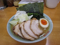 ![]() R19沿いにある豚骨味の家系ラーメン屋。オイラはチャーシュー麺(850円)+半玉子(50円)を注文。スープは家系にしてはアッサリしており、厚木家(の油少なめ)や六角家に近い印象。麺は中太の平打ちで若干縮れ気味で、麺の硬さに注文をつけないと結構歯応え感がある。ほうれん草とキャベツ、海苔が載っている。チャーシューは脂身がトロトロで全体的に柔らかめ。玉子は味付だが味は薄め。コテコテ好きにはお奨めしないが、アッサリ派のオイラの印象は良い。(Sep.2013) |