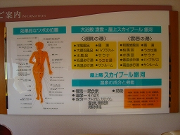 内湯の他に露天風呂、ドライサウナ、ミストサウナなどもある。また、別料金の岩盤浴もあるらしい。効能は肩こり、神経痛、関節痛、リュウマチ、皮膚炎、便秘、婦人病など。因みに入浴料金は420円である。タオル、石鹸やシャンプーは置かれていないので温泉セットを持参しなければならない。