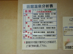 泉質はナトリウム−塩化物強塩泉となっている。お湯は見た目は薄い茶褐色を呈し、なめてみると塩辛い。分析表によると、どうやら飲用も可能らしい。浴用の効能は神経痛、筋肉痛、関節痛、疲労回復、うちみなど。飲用の効能は慢性消化器病、慢性便秘。因みにホテルから函館山も望める。